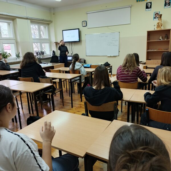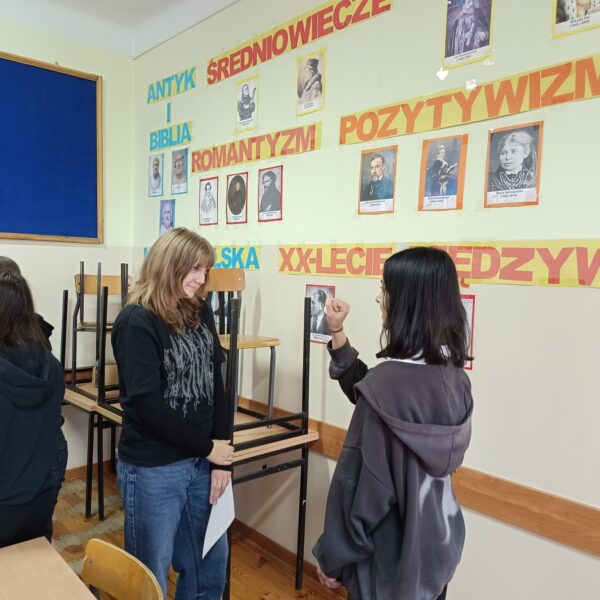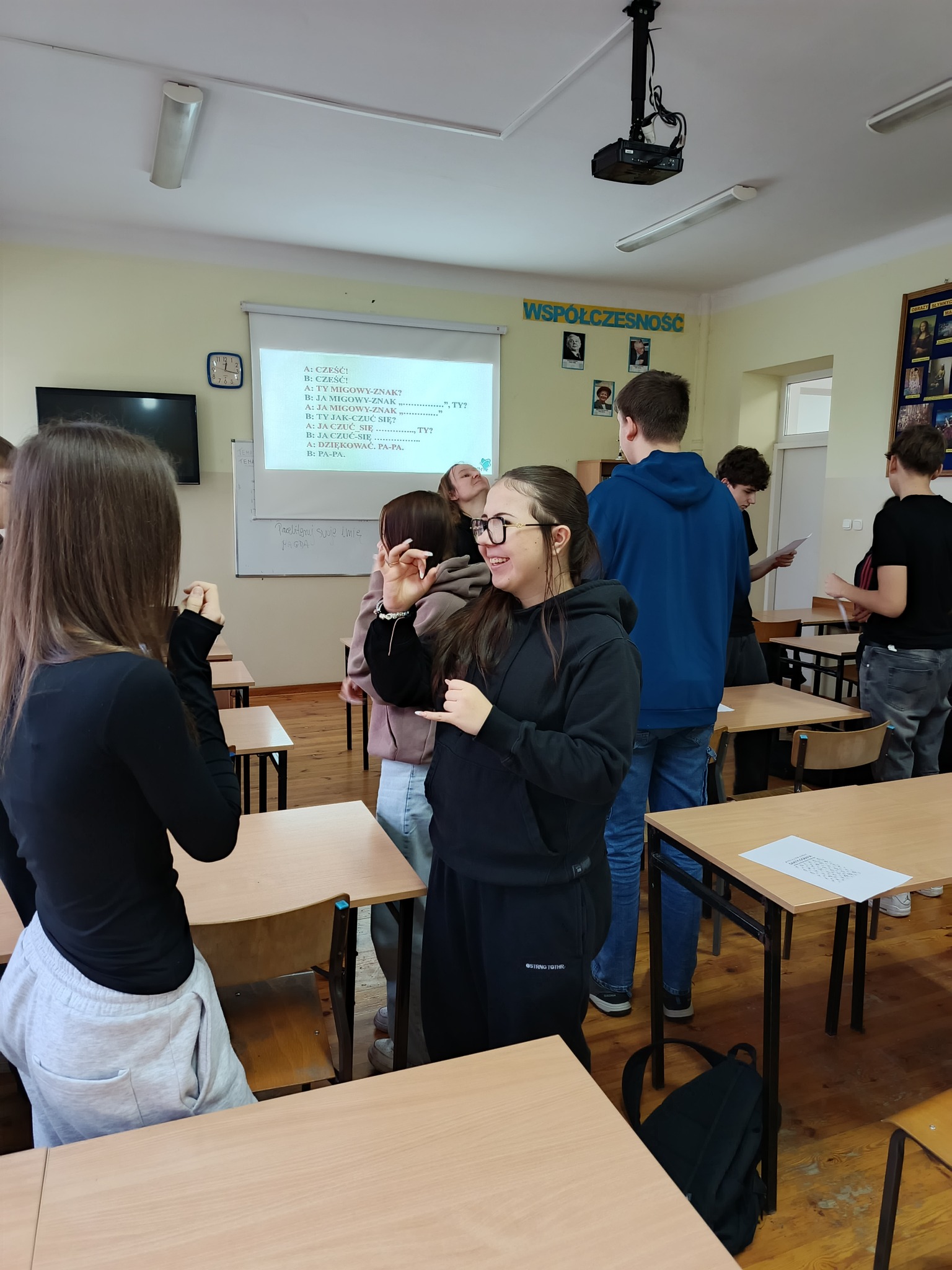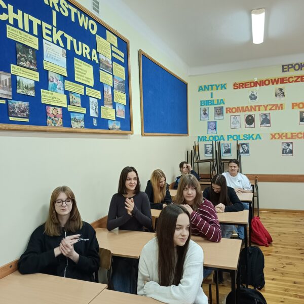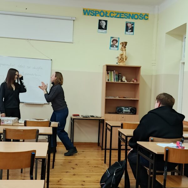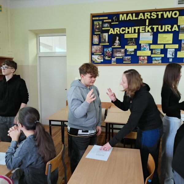 Cykl ośmiu kreatywnych zajęć w absolutnej ciszy poprowadziła Pani Magdalena Bielak-Kościńska, właścicielka EduPJM, warszawskiej szkoły języka migowego. Dzięki nim nasza młodzież poznała daktylografię oraz wizualno-przestrzenne techniki praktycznego porozumiewania się z osobami głuchymi. Nie było to łatwe: niektóre litery ciężko było zapamiętać; z głowy uciekały też znaki wyrażające emocje, ale dzięki zaangażowaniu i regularnym powtórkom uczniowie potrafią już, np. przywitać się i pożegnać, przedstawić się, opisać coś charakterystycznego dla swojego wyglądu lub charakteru. Co najważniejsze, zrozumieli, jak trudna jest codzienność osób niesłyszących, którzy z jednej strony są inni, a z drugiej zupełnie tacy sami.