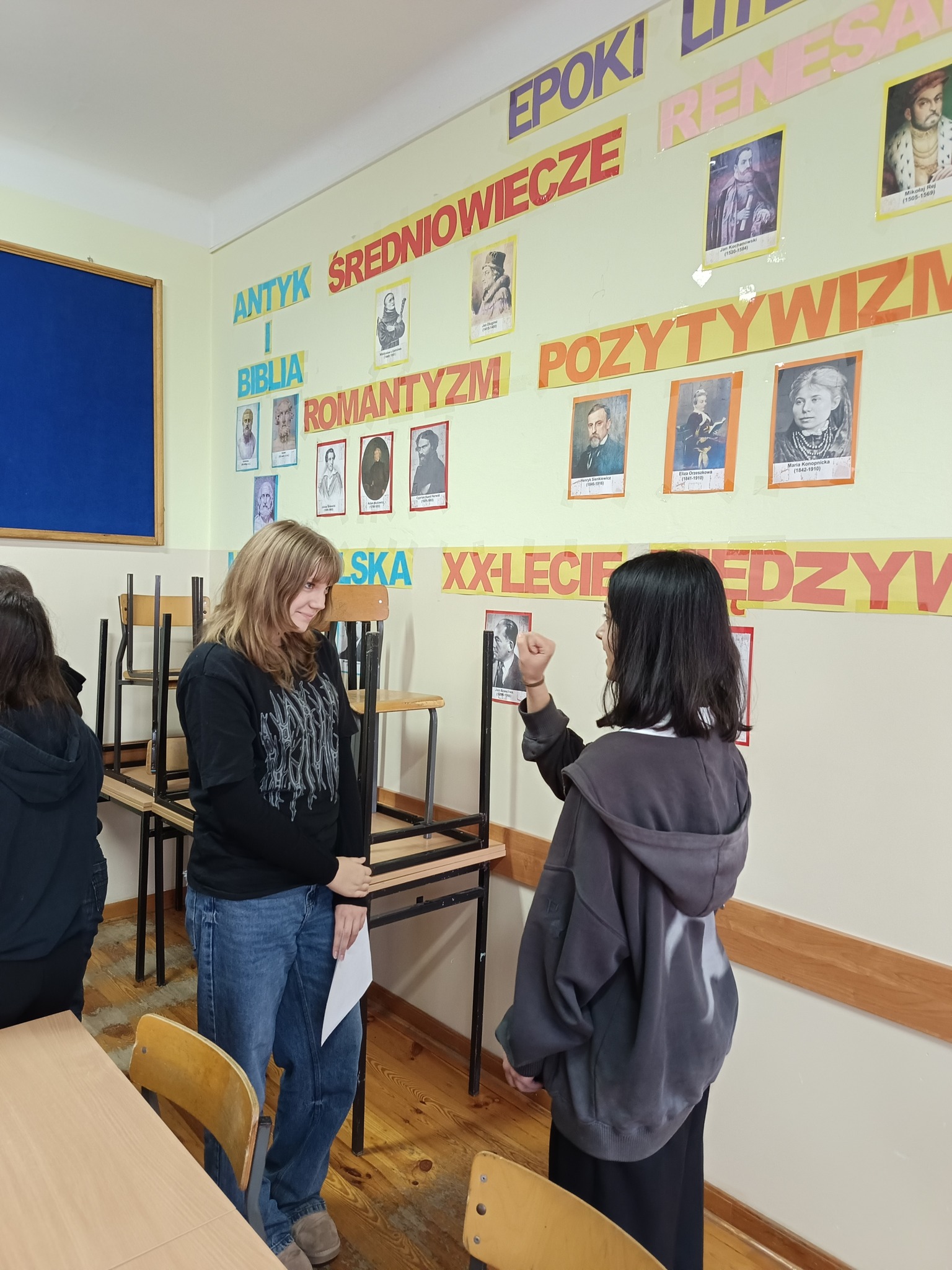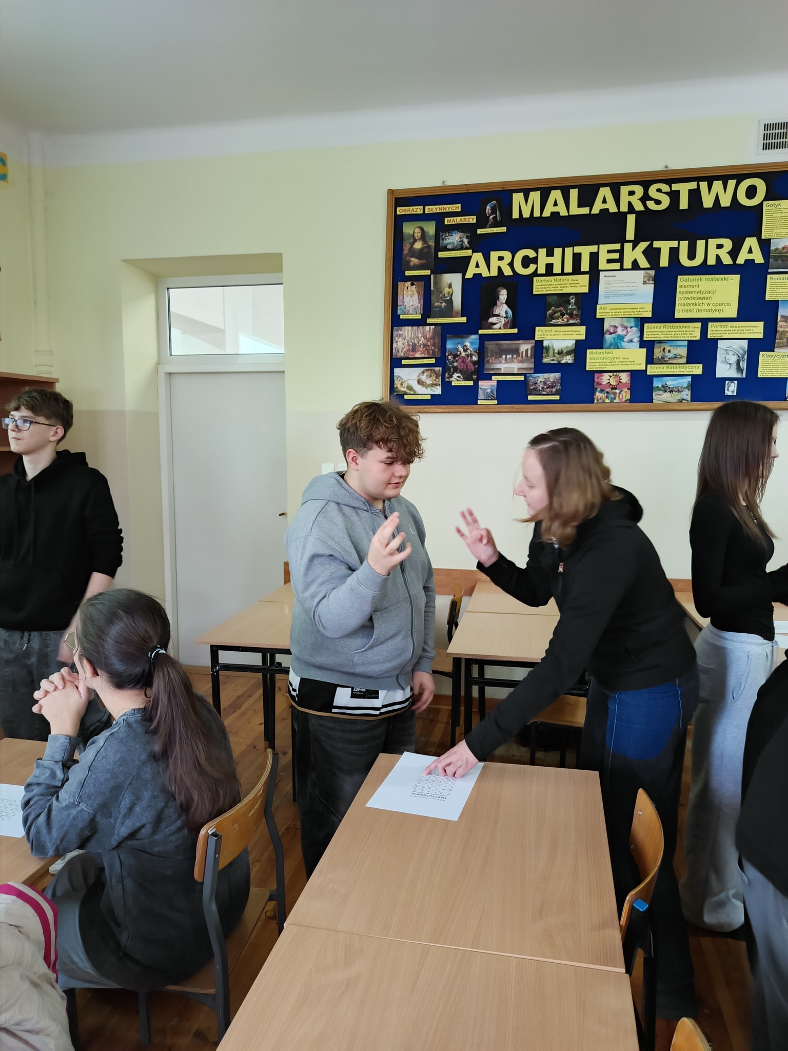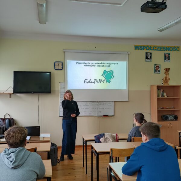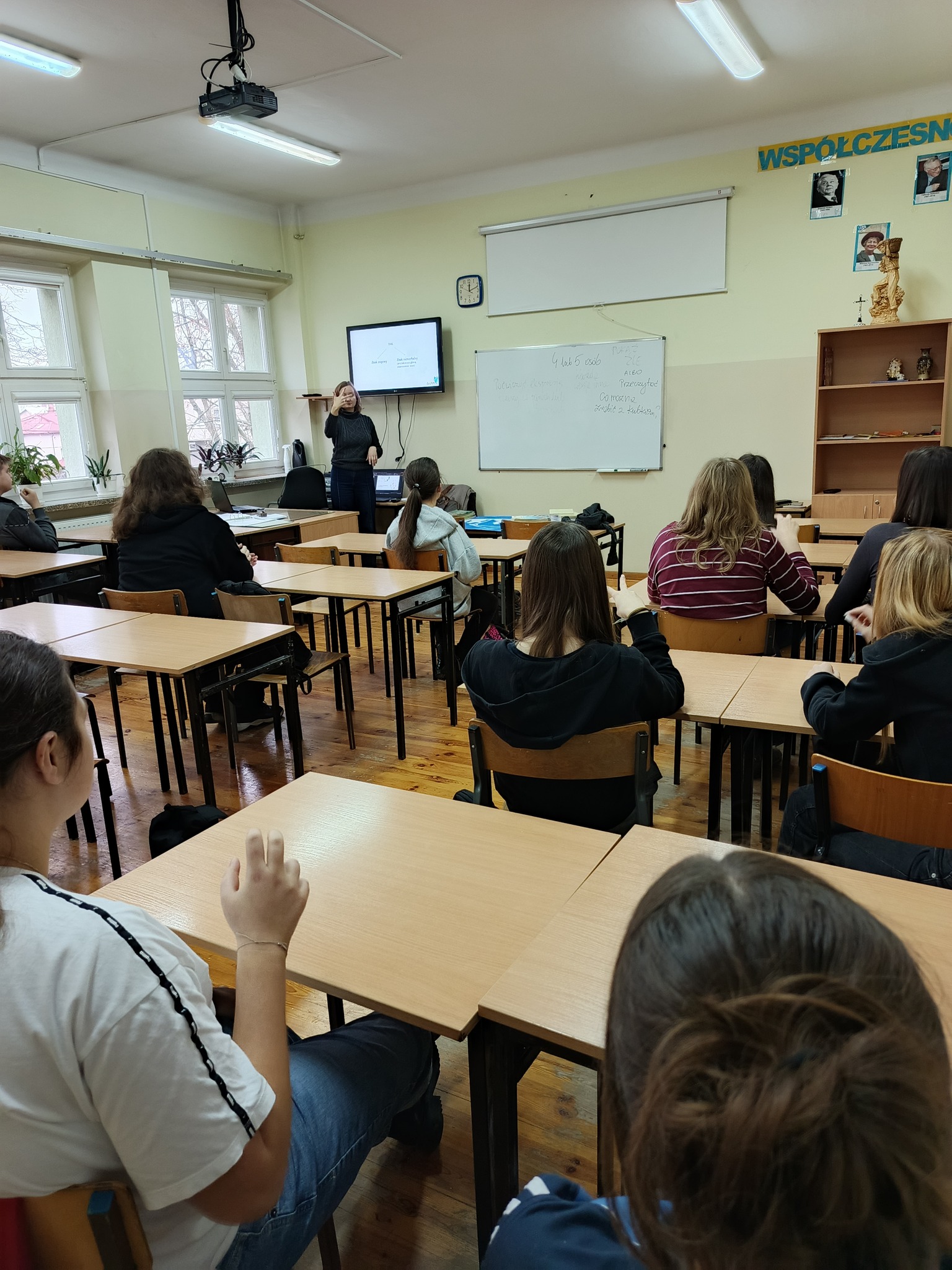 Cykl ośmiu kreatywnych zajęć w absolutnej ciszy poprowadziła Pani Magdalena Bielak-Kościńska, właścicielka EduPJM, warszawskiej szkoły języka migowego. Dzięki nim nasza młodzież poznała daktylografię oraz wizualno-przestrzenne techniki praktycznego porozumiewania się z osobami głuchymi. Nie było to łatwe: niektóre litery ciężko było zapamiętać; z głowy uciekały też znaki wyrażające emocje, ale dzięki zaangażowaniu i regularnym powtórkom uczniowie potrafią już, np. przywitać się i pożegnać, przedstawić się, opisać coś charakterystycznego dla swojego wyglądu lub charakteru. Co najważniejsze, zrozumieli, jak trudna jest codzienność osób niesłyszących, którzy z jednej strony są inni, a z drugiej zupełnie tacy sami.