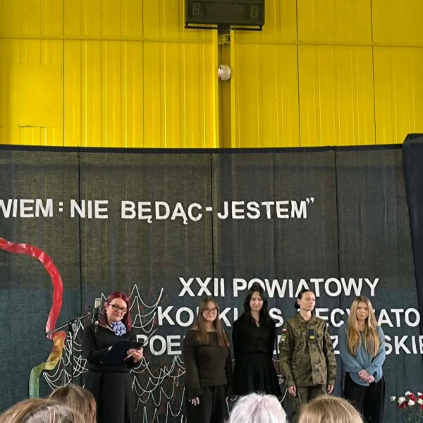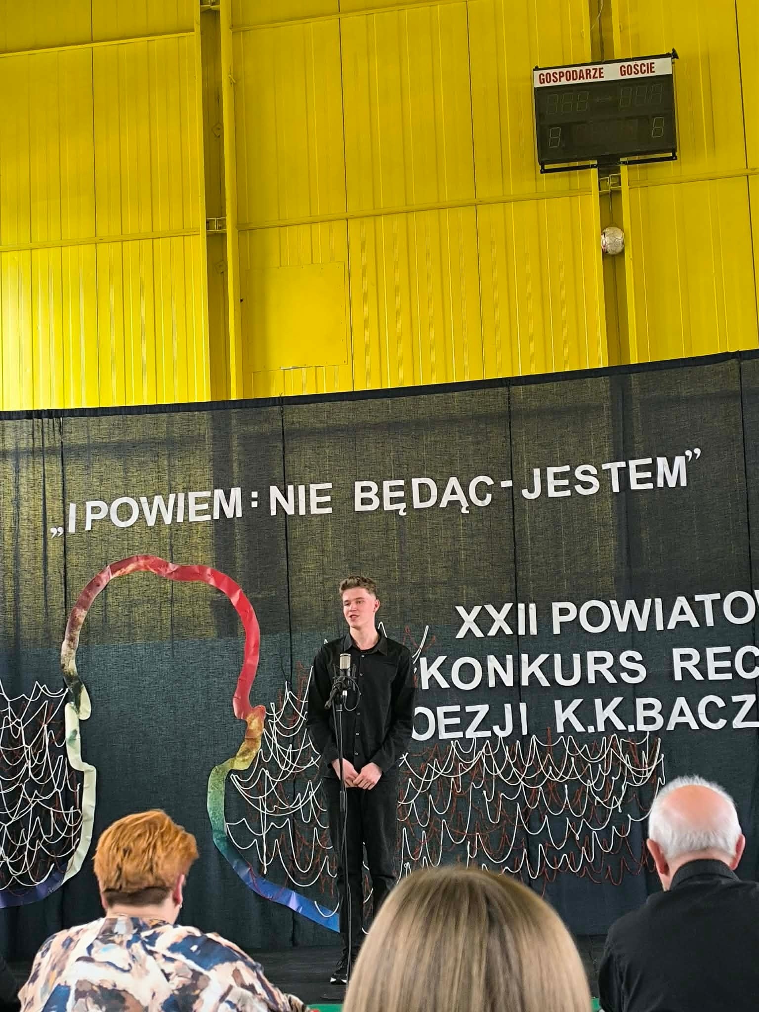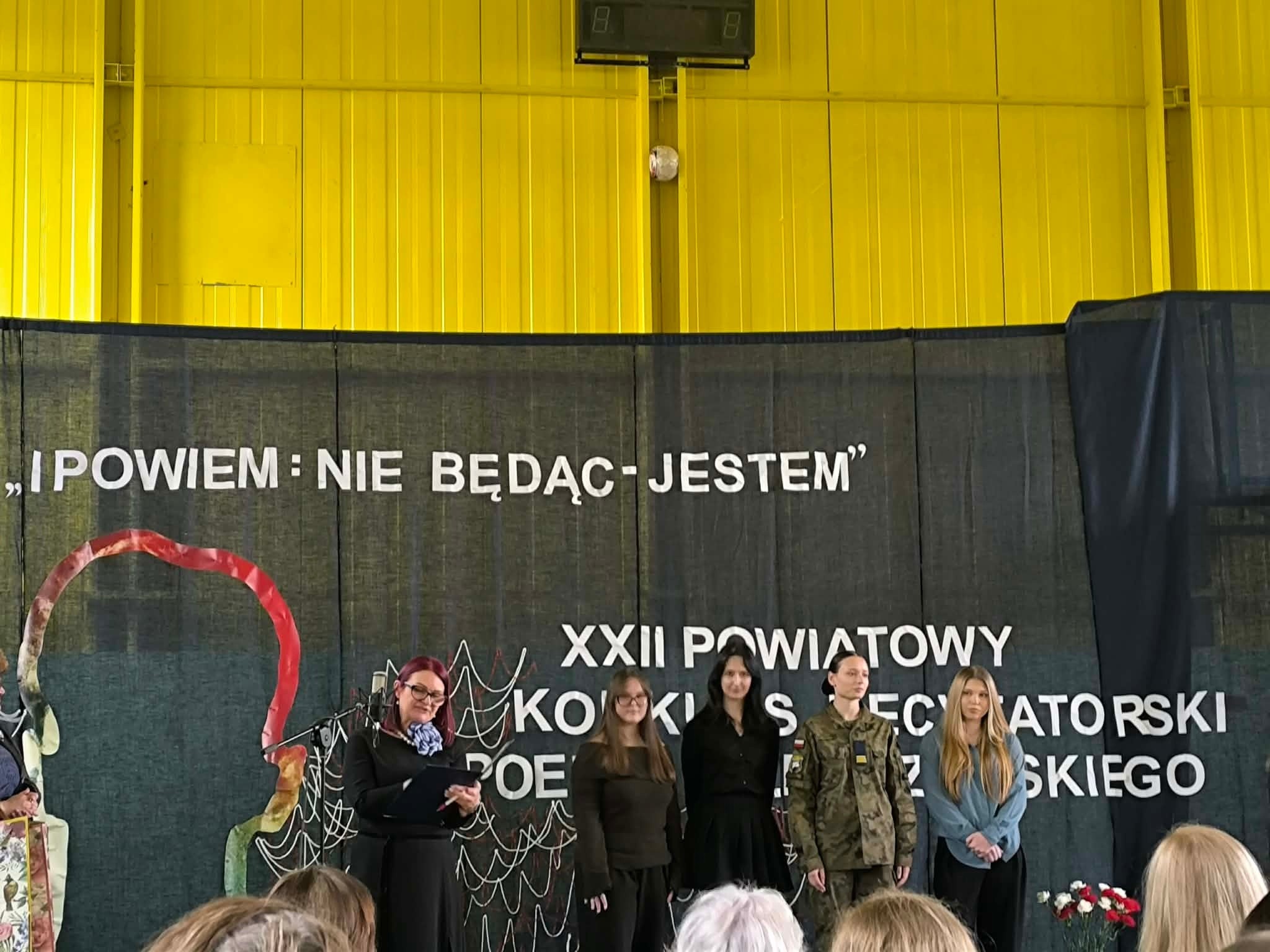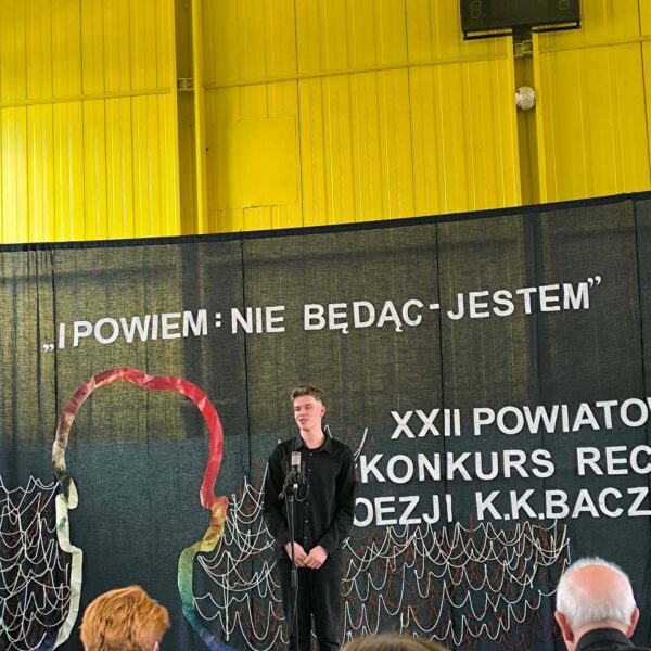 Dnia 25 marca uczniowie: Alicja Augustyniak, Ivanna Pastukh, Adam Konarski, Roksana Orzechowska, Aron Wnorowski, Krzysztof Zdrojewski, Piotr Jacyna i Nicola Łuszczyńska godnie reprezentowali społeczność szkolną podczas XXII powiatowego konkursu recytacji poezji Krzysztofa Kamila Baczyńskiego. Aron Wnorowski zajął II miejce w kategorii: prezentacja multimedialna, Krzysztof Zdrojewski zajął III miejsce w kategorii: wiedza o autorze, a Alicja Augustyniak otrzymała wyróżnienie w kategorii: wizja plastyczna. Wszystkim uczestnikom gratulujemy i życzymy dalszych sukcesów.